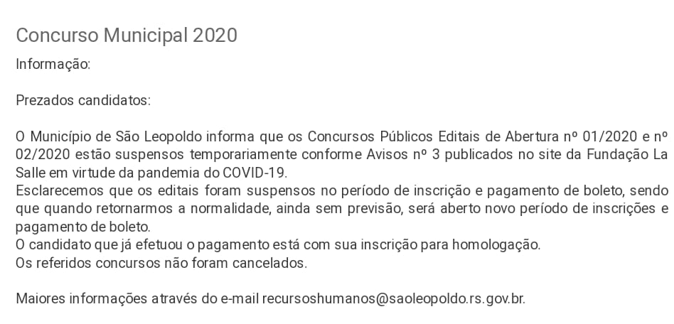 O concurso para a Prefeitura de São Leopoldo no Estado do Rio Grande do Sul está suspenso, porém, a banca confirmou que haverá reabertura do prazo para efetuar inscriçaõ.A banca responsável é a Fundação La Salle.