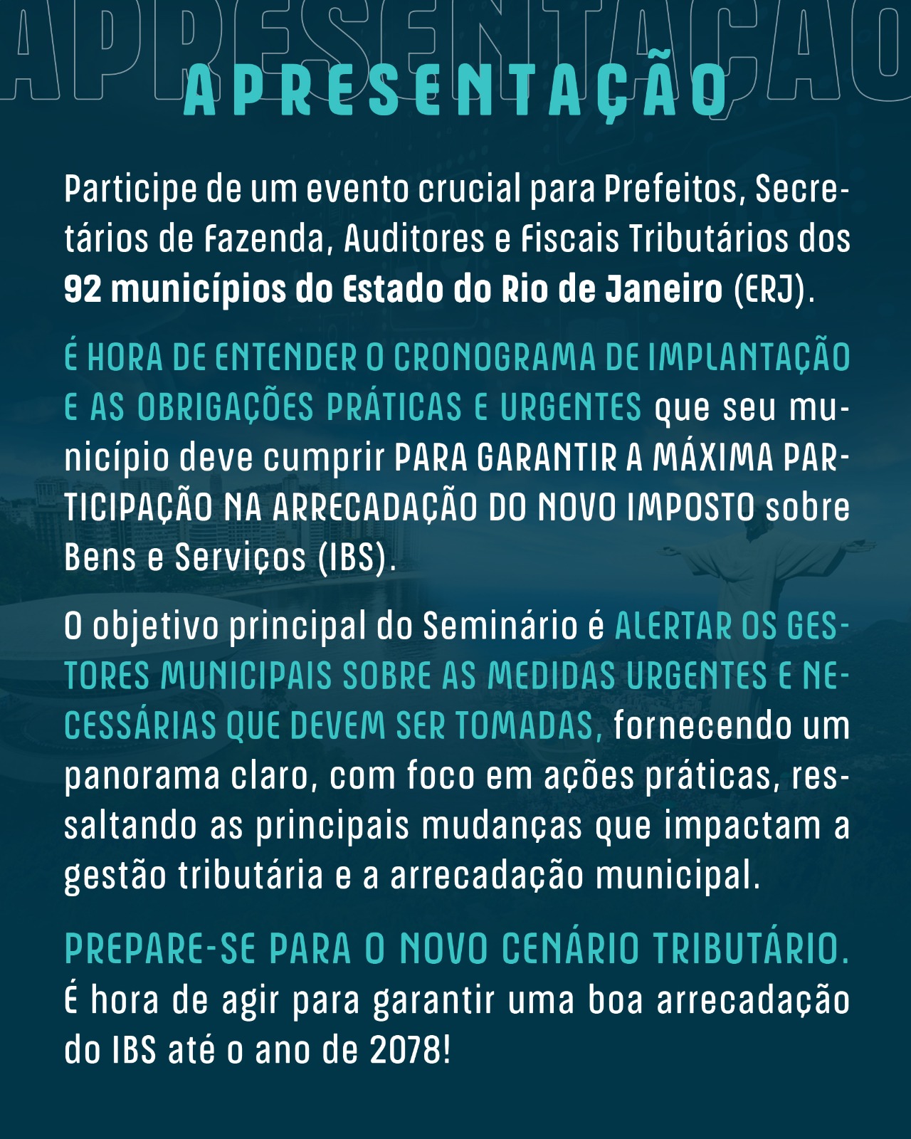 Eventos LINK AO VIVO: II SEMINÁRIO DA RTC NO RIO DE JANEIRO (OU RJ) DIA 26/11/2025 por Grupo Editores Blog. 26 de novembro de 2025 por Grupo Editores Blog. 26 de novembro de 2025 5 Share on Facebook Share Share on TwitterTweet Share on Pinterest Share Share on LinkedIn Share Send email Mail Print Print Share on Facebook Share Share on TwitterTweet Share on Pinterest Share Share on LinkedIn Share Send email Mail Print Print 0 FacebookTwitterEmail Grupo Editores Blog. postagem anterior Fenafim, Anafisco e Agafim solicitam suspensão de concurso de Três Passos/RS que prevê nível médio para funções típicas da Administração Tributária Você também pode se interessar por: O II Seminário da Reforma Tributária do Consumo... 25 de novembro de 2025 AAFIT/SP e FENAFIM celebram sucesso do evento conjunto... 18 de novembro de 2025 II Seminário sobre a Reforma Tributária do Consumo 13 de novembro de 2025 Projeto Nossa reforma Tributária 11 de novembro de 2025 REFORMA TRIBUTÁRIA EM DEBATE: FENAFIM E SENAM UNEM... 11 de novembro de 2025 URGENTE – TREINAMENTO EM AUDITORIA IBS – Gratuito 5 de novembro de 2025 Prefeituras no WhatsApp: como usar a ferramenta de... 4 de setembro de 2025 PARTICIPE DO 36° CONGRESSO DA FENAFIM E DO... 20 de maio de 2025 IX Encontro Nacional dos Tribunais de Contas (ENTC),... 15 de novembro de 2024 IBS e CBS: Fundamentos da Reforma Tributária Brasileira 18 de outubro de 2024 Deixar um Comentário Cancelar RespostaComents Salve meu nome, email e site neste navegador para a próxima vez que eu comentar.