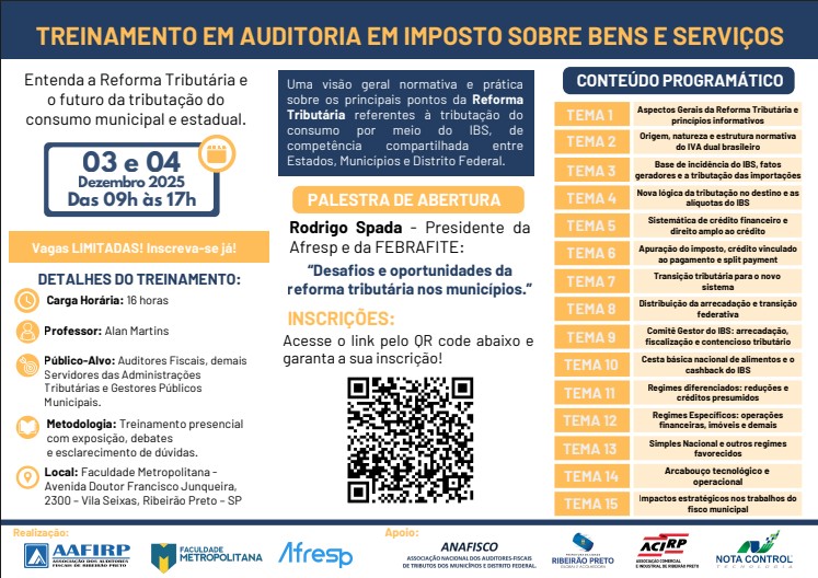 A Associação dos Fiscais de Ribeirão Preto-SP e a AFRESP – Associação dos Auditores Fiscais da Receita Estadual de São Paulo Firmaram parceria inédita para realização de um CURSO GRATUITO SOBRE AUDITORIA IBS.